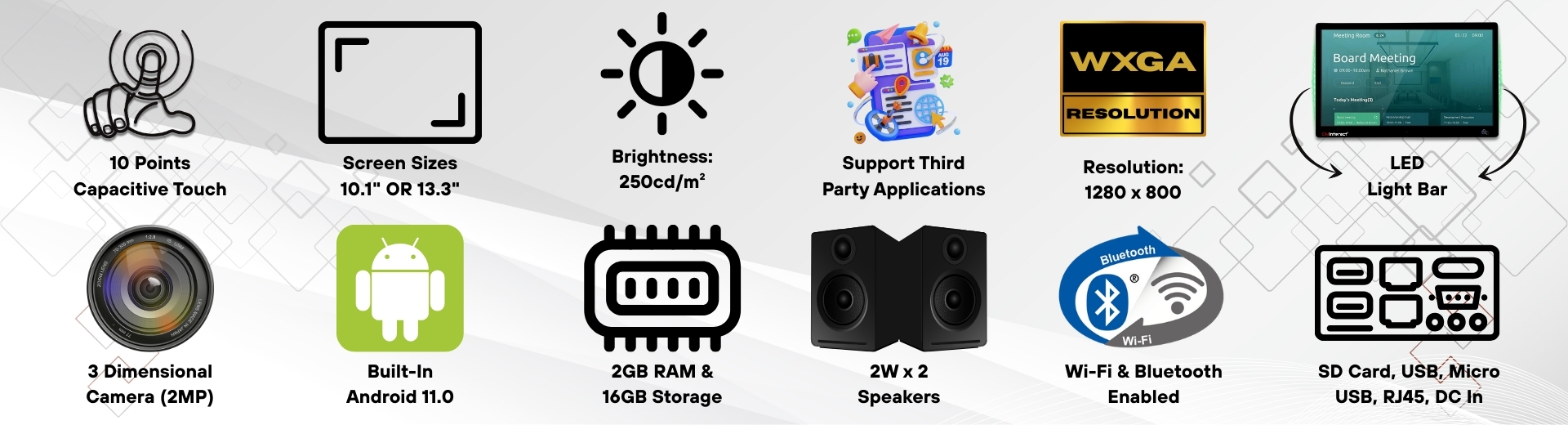 Packed with intelligent features, the DMInteract Room Manager offers customizable LED lighting to create the right ambiance, a 2MP three-dimensional camera for interactive applications, and Power over Ethernet (PoE) for hassle-free installation without the need for extra power supplies. Its 1280 x 800 resolution with 250cd/m² brightness delivers sharp, crystal-clear visuals for instant visibility of schedules and upcoming bookings. Designed with flexibility in mind, it is ideal for diverse applications such as meeting room management, patient monitoring in healthcare, restaurant ordering systems, or even as a commercial display. The built-in dual 2W speakers, 3.5mm audio ports, and multiple connectivity options (Wi-Fi, Ethernet, and Bluetooth 4.0) ensure smooth communication and integration across your workplace.